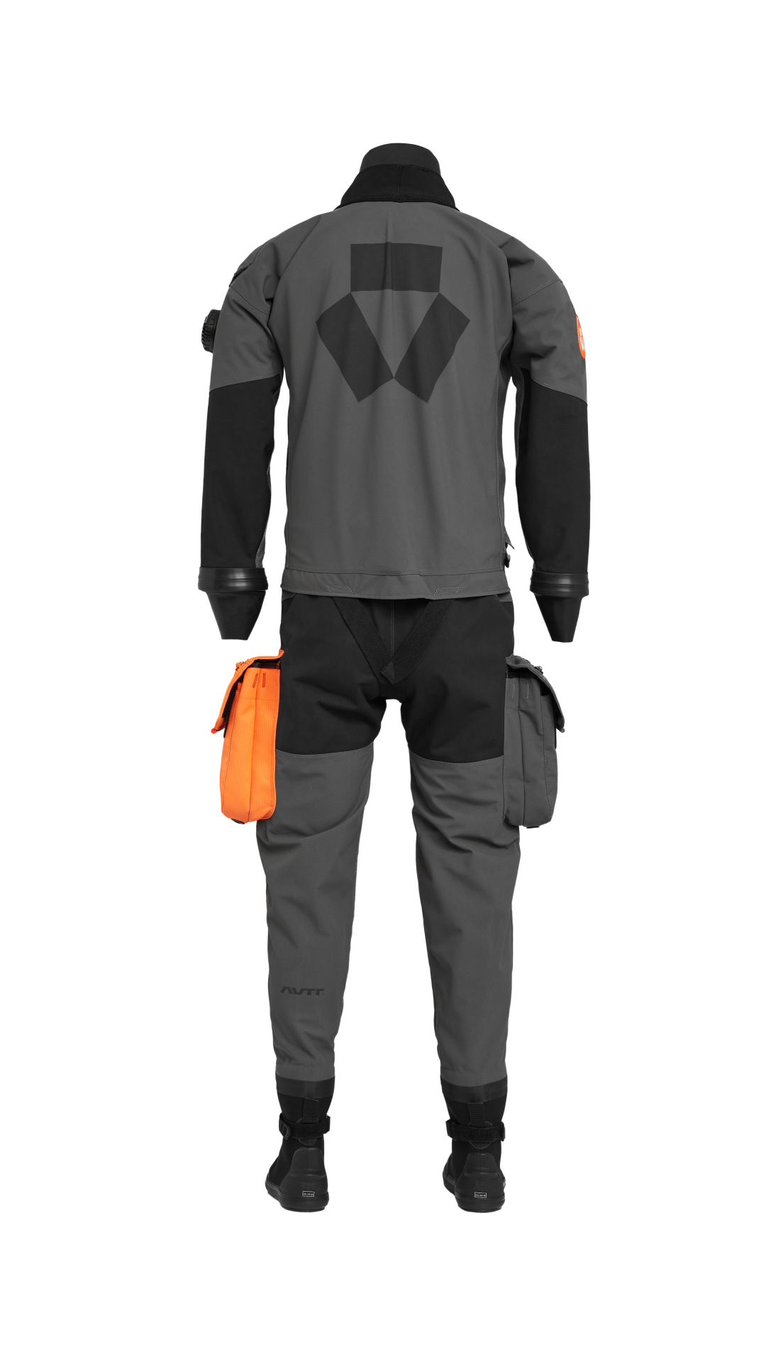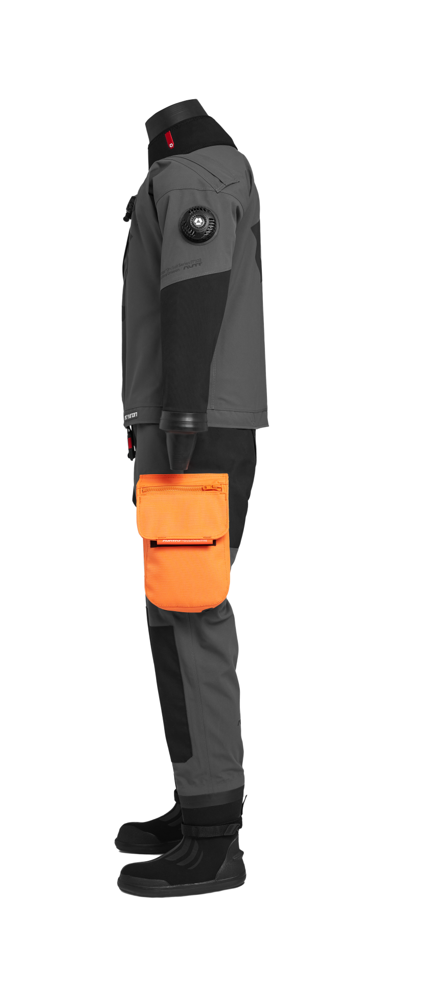 Comprehensive range of features in a full, technical drysuit configuration: telescopic torso, two technical pockets, slim fit and good air mobility.