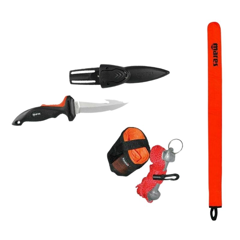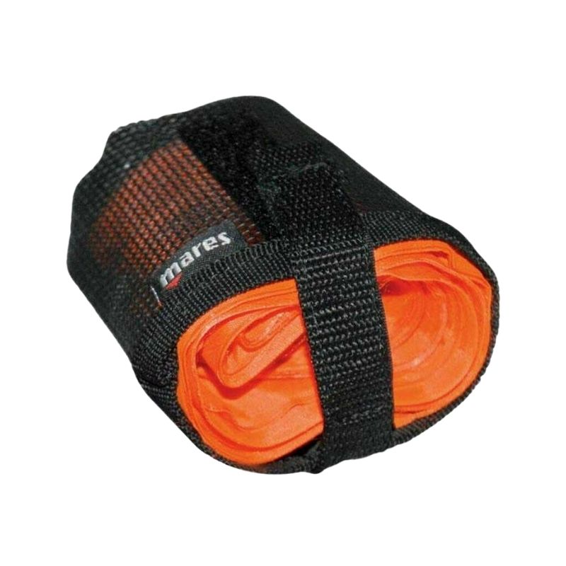 MARES compact safety buoy with weight is a mesh nylon sack equipped with a fastening carabiner containing the marker buoy, line and weight. this highly visible orange diver marker buoy is useful both when at the surface, to show your position to the boat and can also be deployed whilst ascending to identify where you will be surfacing.