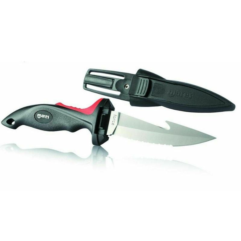 The mares force knife is a standard-size knife and can be easily fastened to the mares BCDs as well as any dive belts plus your leg as there are multiple attachment points and accessories. there are screws that attach the sheath to the Mares BCD pockets, rubber leg straps for you to wear around your calf as well as being able to thread a weight belt through the sheath. the most popular way of carrying a knife is on the calf, however, everyone has a personal choice and the force knife gives you the ability to choose. the soft ergonomic grip offers a secure and comfortable hold and makes it easy to use and hold.