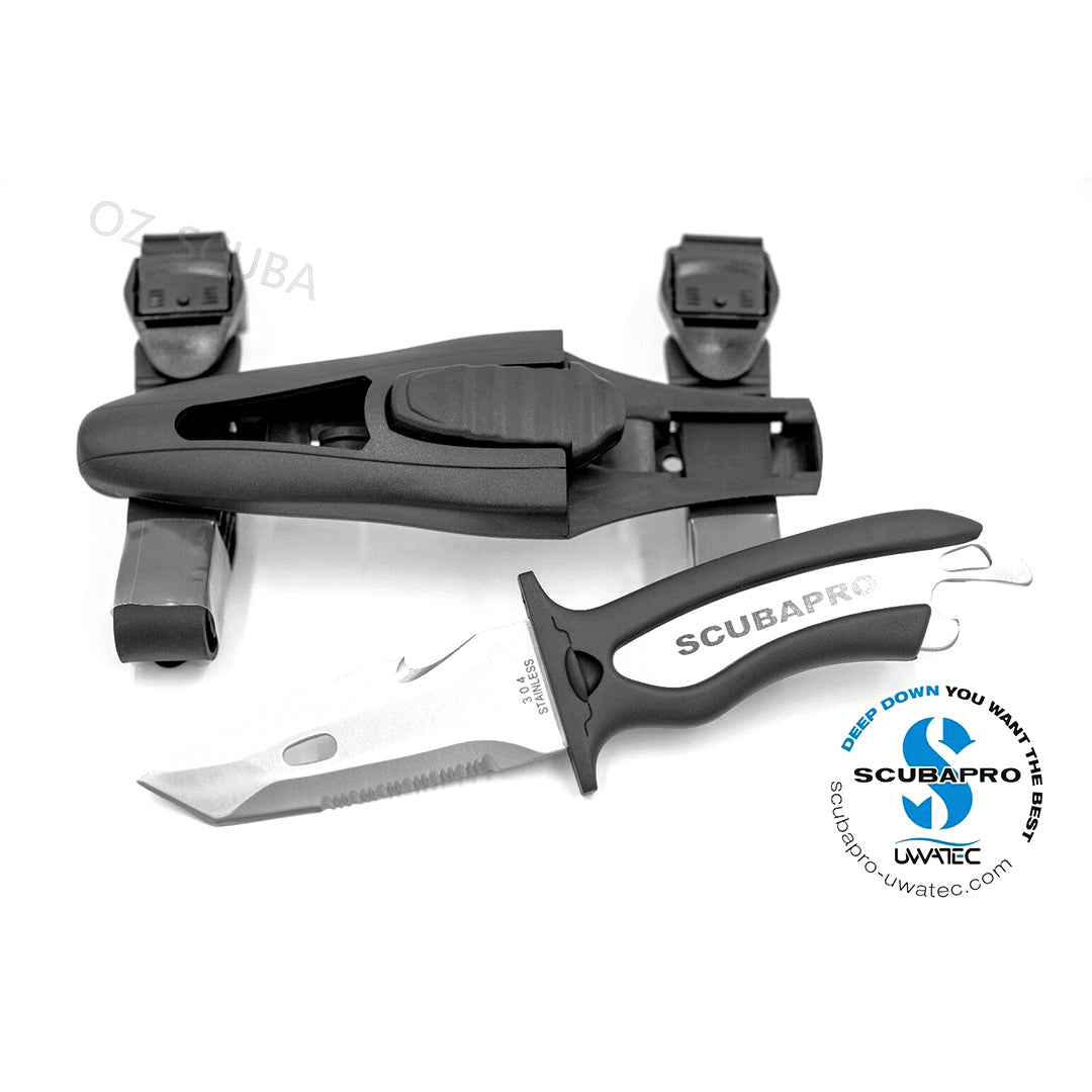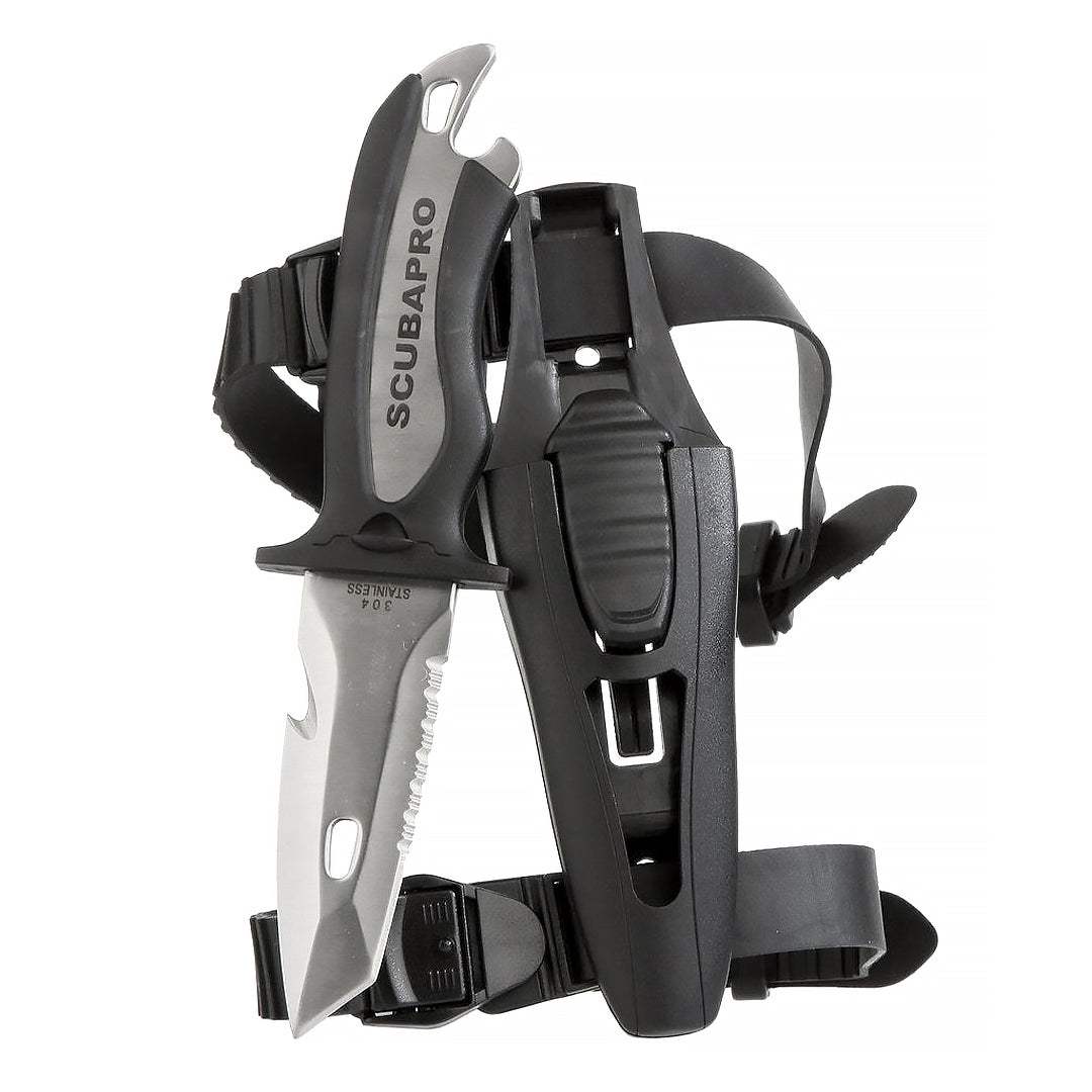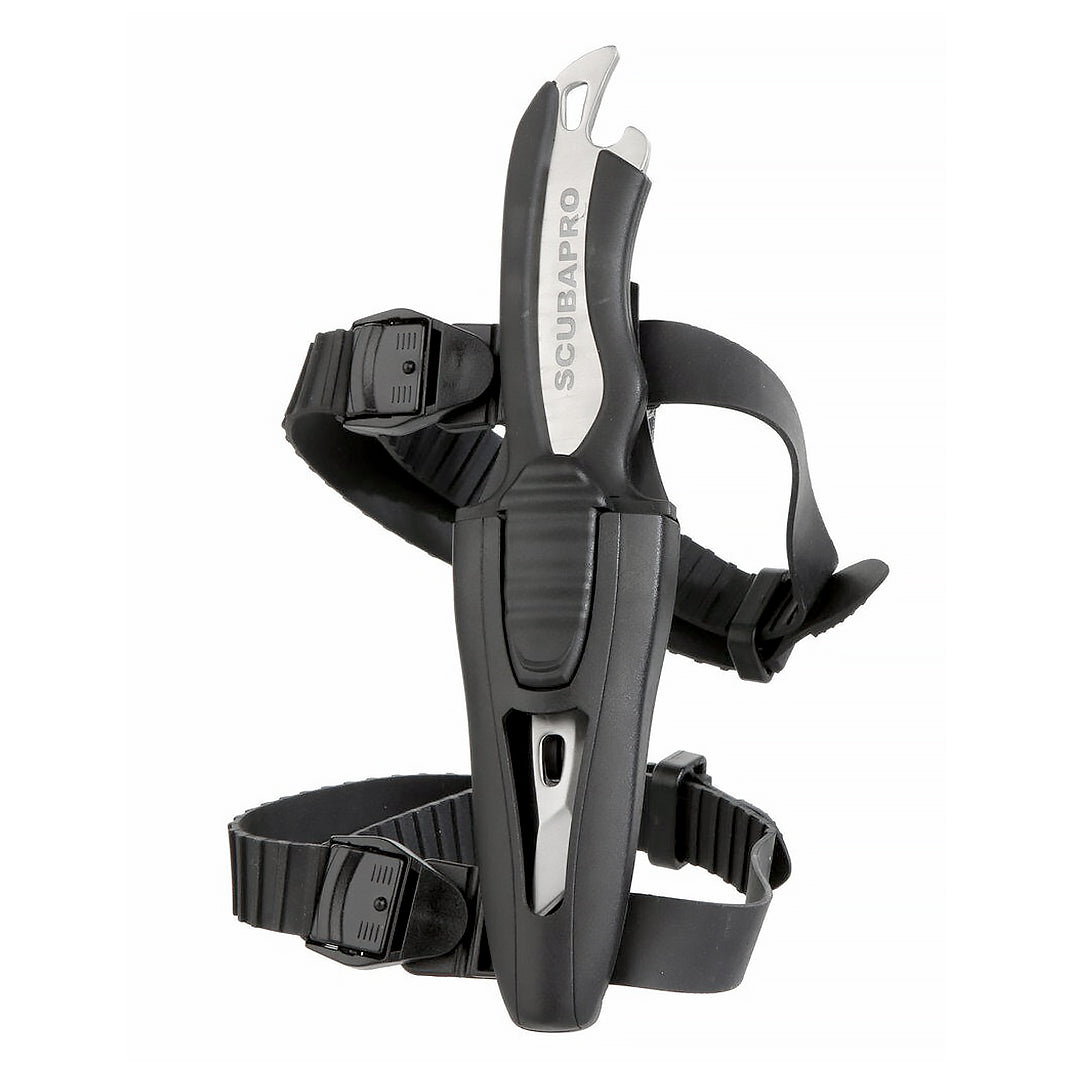 The plastic sheath has a one handed push button locking release to prevent accidental lose of the knife. The sheath can be fitted to the leg using the quick release rubber straps or to a BCD using the supplied nuts, plastic heads and bolts.