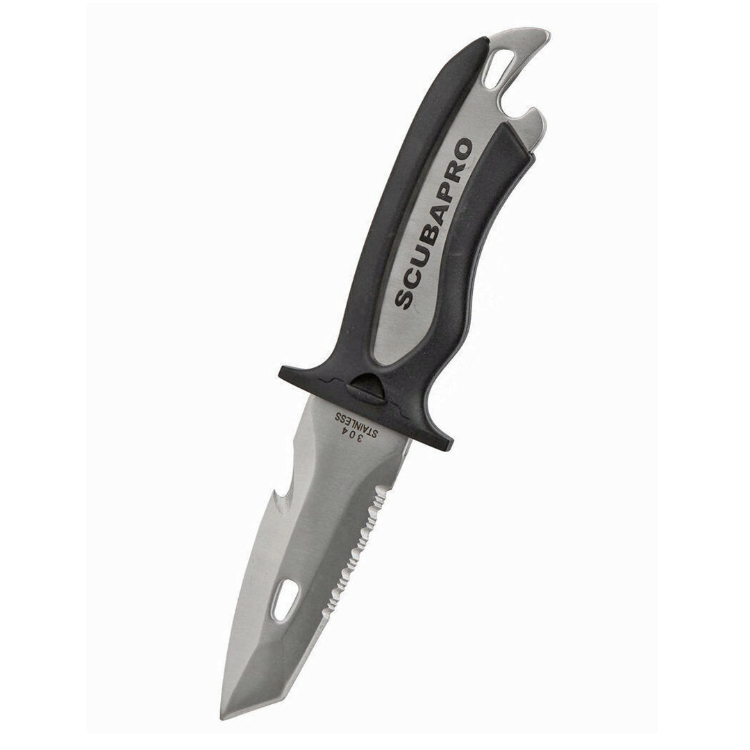 The Mako Stainless Steel Knife from Scubapro is constructed from 304-grade hard-tempered stainless steel, providing an excellent cutting edge and good resistance to surface oxidation. The blade has a cutting / serrated edge on one side and a line cutter on the otherside. The stainless steel blade passes through the plastic handle to form a bottle opener on the end.
