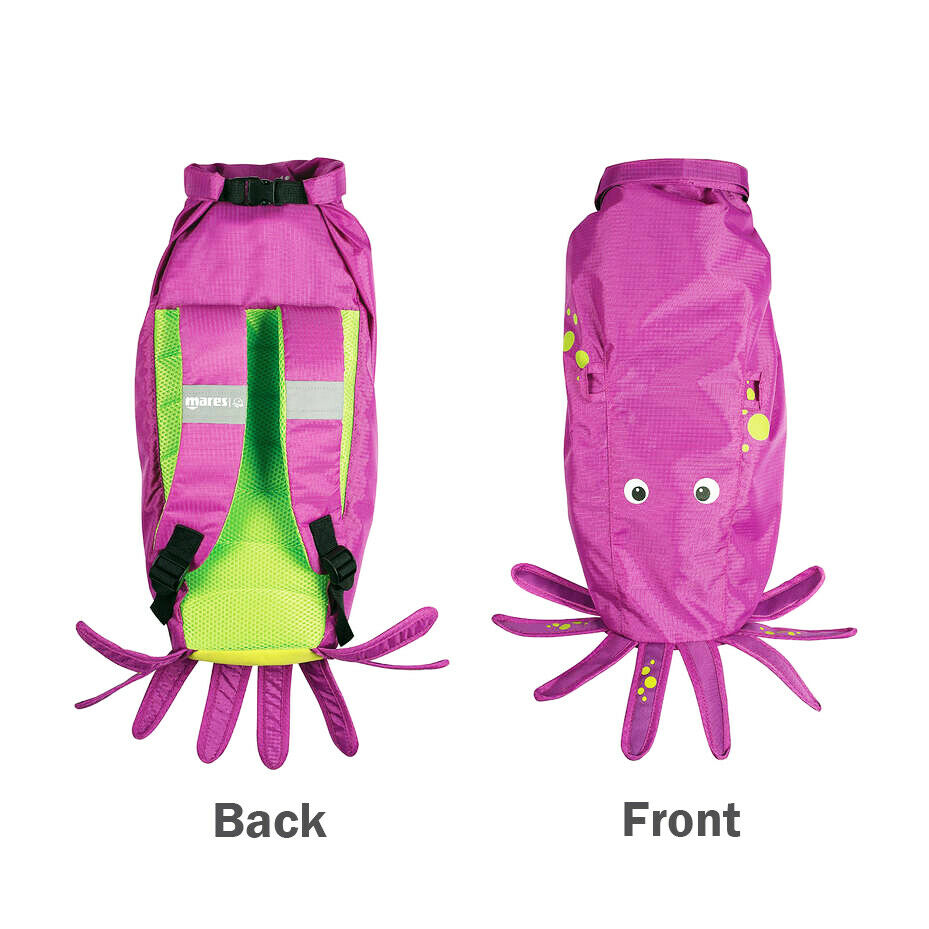 Everything packs neatly into the Sea Pals Octopus Backpack, a playful character dive bag that kids will love carrying to the beach or pool. The backpack is practical too, featuring a roll-up water-sealed closure, vented bottom, water-resistant material, and padded adjustable straps.