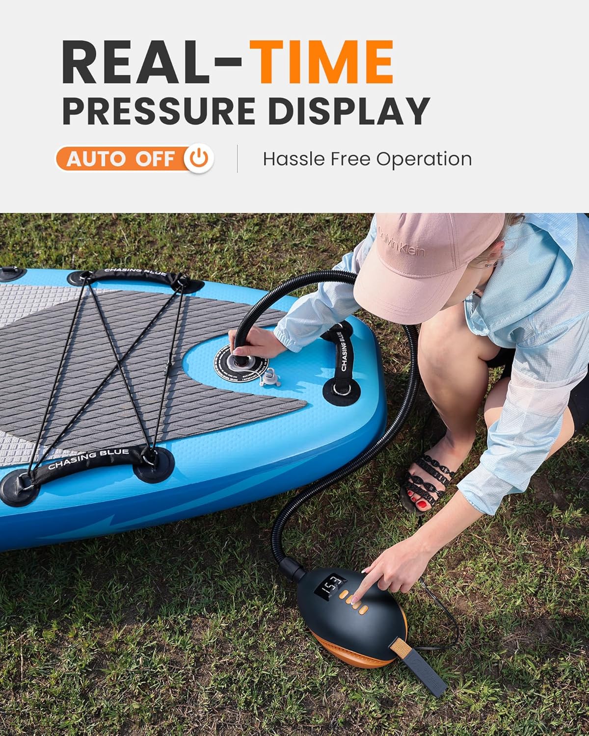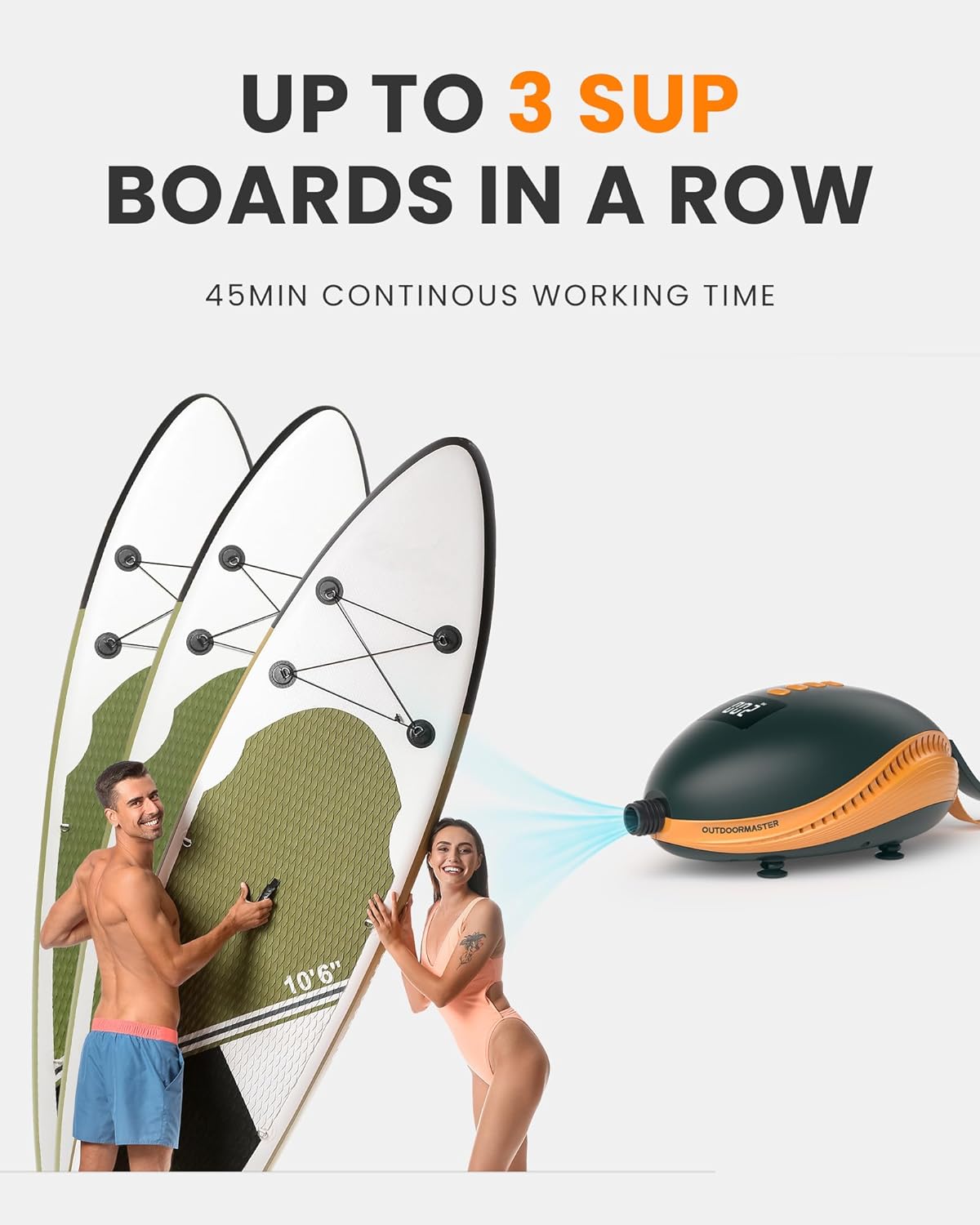 - DIGITAL DISPLAY WITH REAL TIME PRESSURE MONITORING - Press “+”button or “-” button to set your desired pressure, the digital display will show setting pressure and monitor the pressure in real time. Inflation is so easy with OutdoorMaster Electric Paddle Board Pump!4