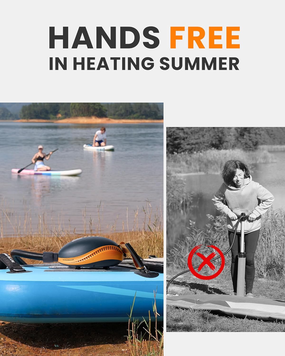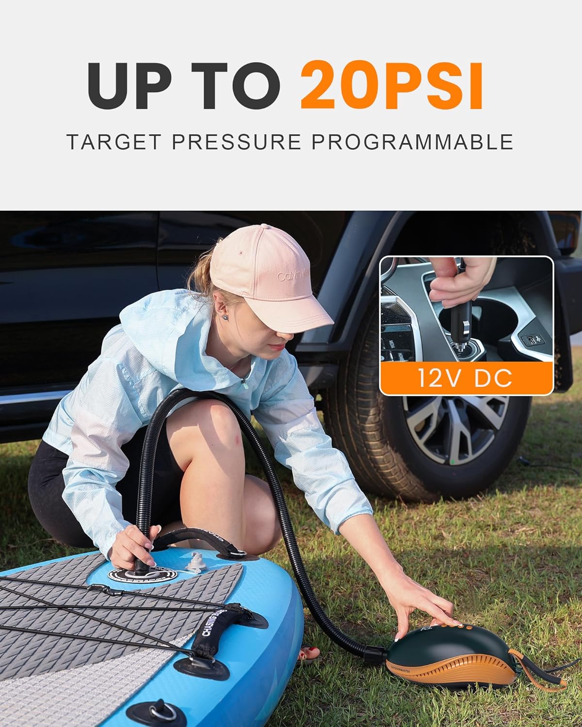 - AUTO-OFF & CONSTANTLY WORKING FOR EASY INFLATION - Leaving Dolphin Electric Paddle Board Pump to auto turn off when the desired pressure is reached during inflating, which could prevent your SUP boards, inflatables or other pool toys to damage. The portable paddle board pump could inflate continuously, which could save your time to enjoy your summer paddling.3
