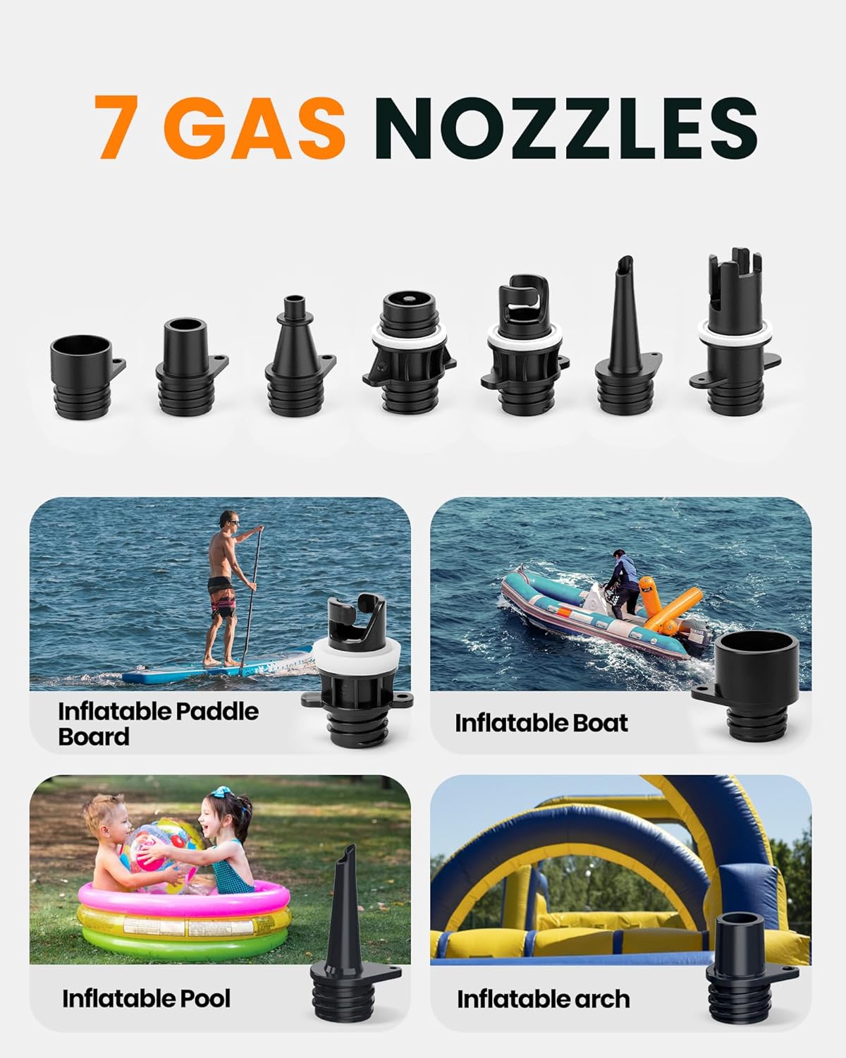 - 12V DC CAR CONNECTOR & FULL SET NOZZLES ATTACHMENTS - Connects to your car's 12V DC connector. Features a 12A fuse for increased safety. Electric sup air pump comes with 7 nozzles to fit most high pressure inflatables like stand up inflatable paddle boards, air beds, kayaks, boats, arch, swimming pools, tents and so on.2