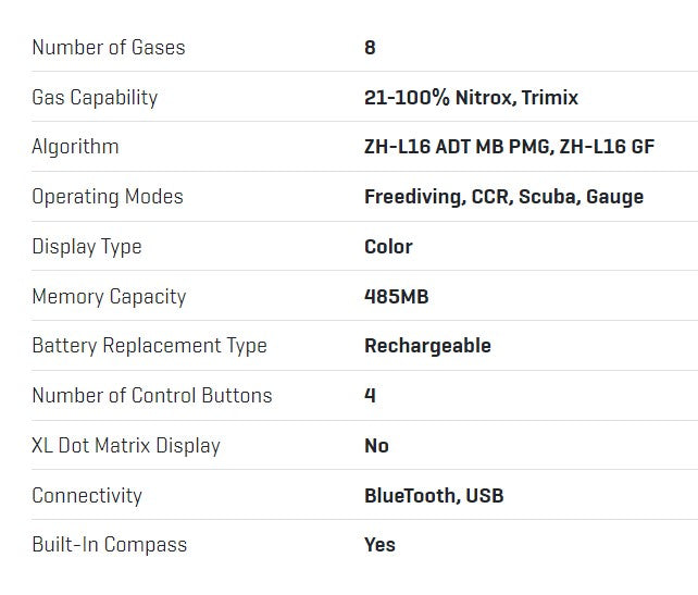 - Wireless air Integration monitors tank pressure plus provides true remaining bottom time (RBT) and allows air consumption to be factored into the decompression calculation.