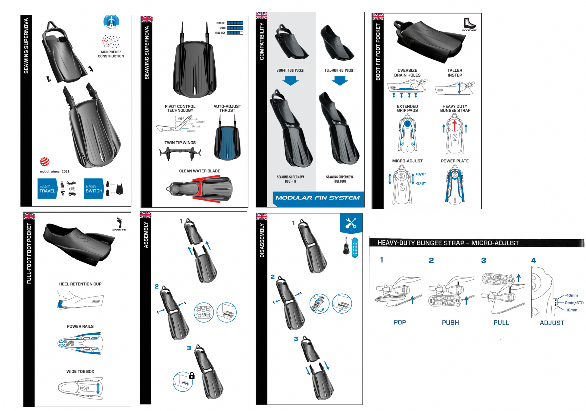 SCUBAPRO’s 2022 Seawing Supernova represents the next generation of powerful SCUBAPRO fins. Winner of the prestigious, internationally-recognised Red Dot Award for product design, the new Seawing Supernova is a step up from the Seawing Nova in performance, construction, fit and versatility. The flexible Auto-Adjust central panel fine-tunes the angle of attack according to the strength of kick by counter-pivoting, providing a milder angle of attack for comfort when kicking gently, a more aggressive angle of attack when kicking at full strength, and anything in between. When it comes to frog and alternate kicks, the new twin-tip winglets increase control and markedly improve maneuverability. The Seawing Supernova’s innovative two-piece design, with blade and foot pocket molded separately, makes transport easy, and with the optional full foot pocket the fin can be modified to handle any warm-water dive scenario. The Supernova is the go-to fin for avid recreational and professional divers seeking maximum speed, power and kicking control in all diving conditions.