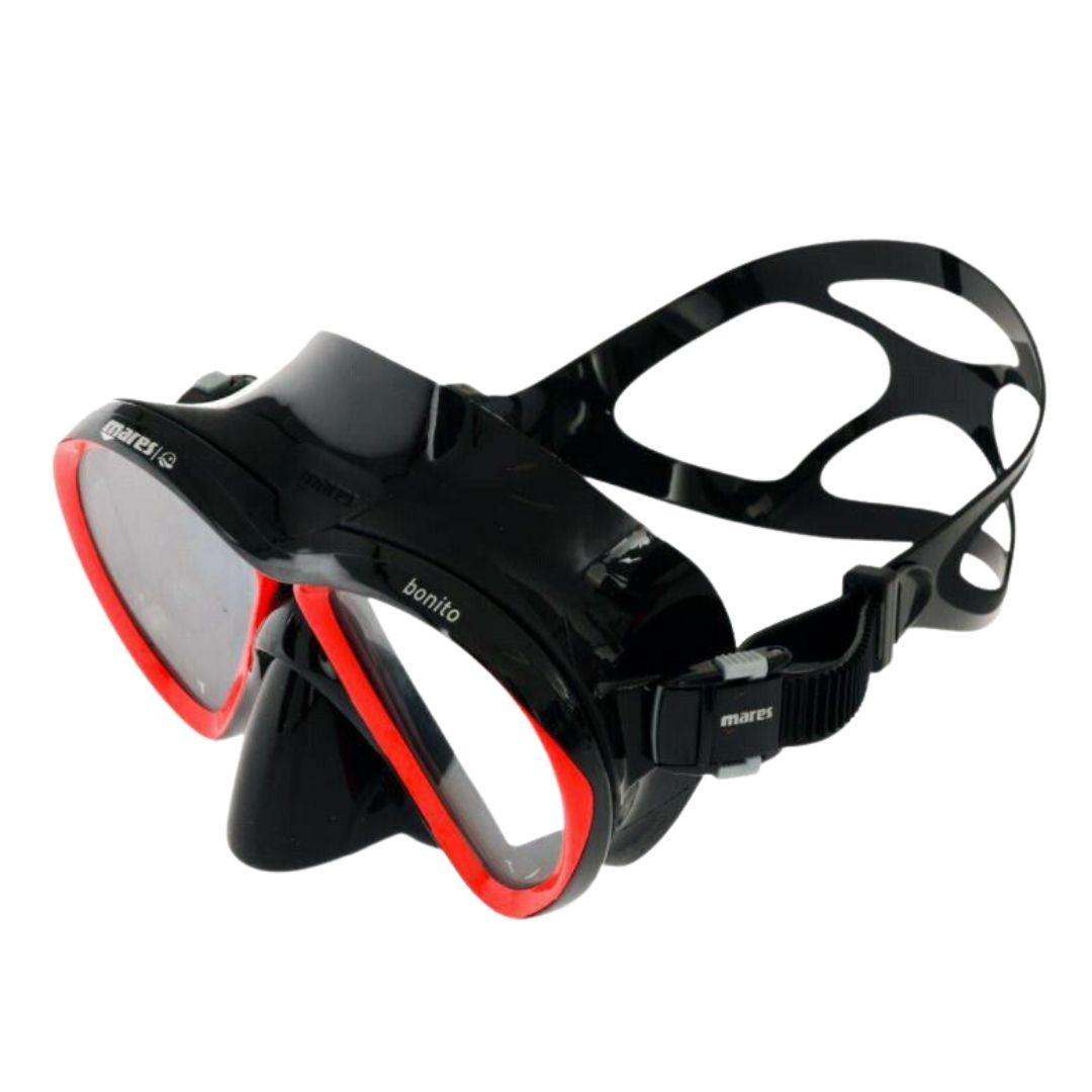 Mares Bonito面膜: Mares Bonito 面罩和通气管套装由高品质 100% 硅胶制成,配有钢化玻璃镜片,由于镜片较大,视野开阔,即使长时间佩戴也能提供超舒适感。 Mares Bonito 面罩不仅以其舒适性而且耐用性而闻名,这意味着该面罩上的侧夹非常耐用,并且在正确的护理和处理下可以使用多年。