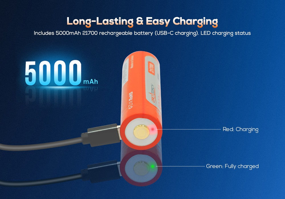 High-Capacity 21700 Li-ion Battery (USB-C Charging): Long runtime and convenient recharging