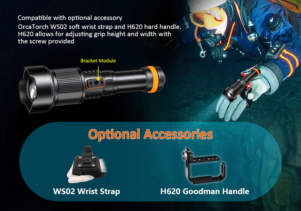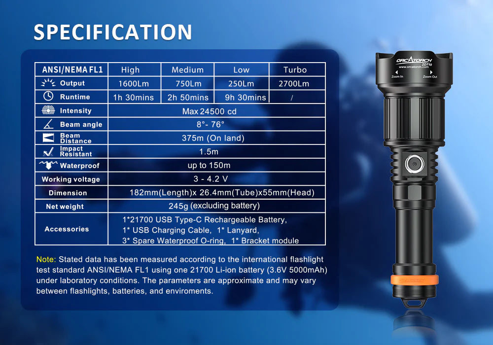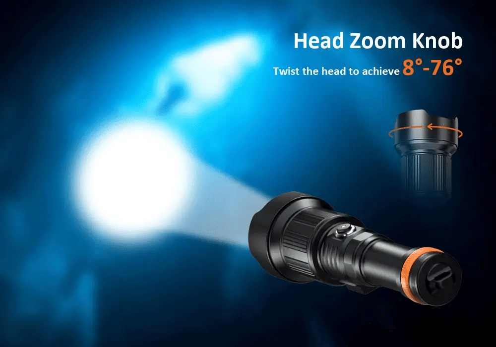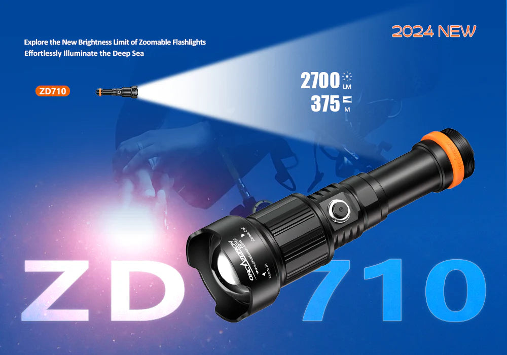 The OrcaTorch ZD710 is a versatile underwater dive light with an adjustable beam angle, delivering up to 2700 lumens and a land distance of 375 meters. Its adjustable beam angle (8° to 76°) provides flexibility for diverse underwater lighting needs, whether exploring caves or observing marine life.