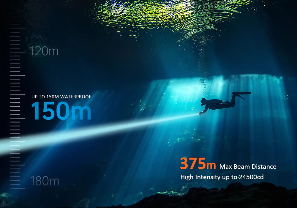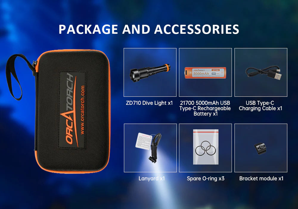The efficient charging system features a 5000mAh 21700 USB Type-C rechargeable battery for convenient charging. With the user-friendly design and a secure locking function to prevent accidental activation, the ZD710 is a top-notch dive flashlight suitable for depths up to 150 meters, adapting seamlessly to various underwater environments.
