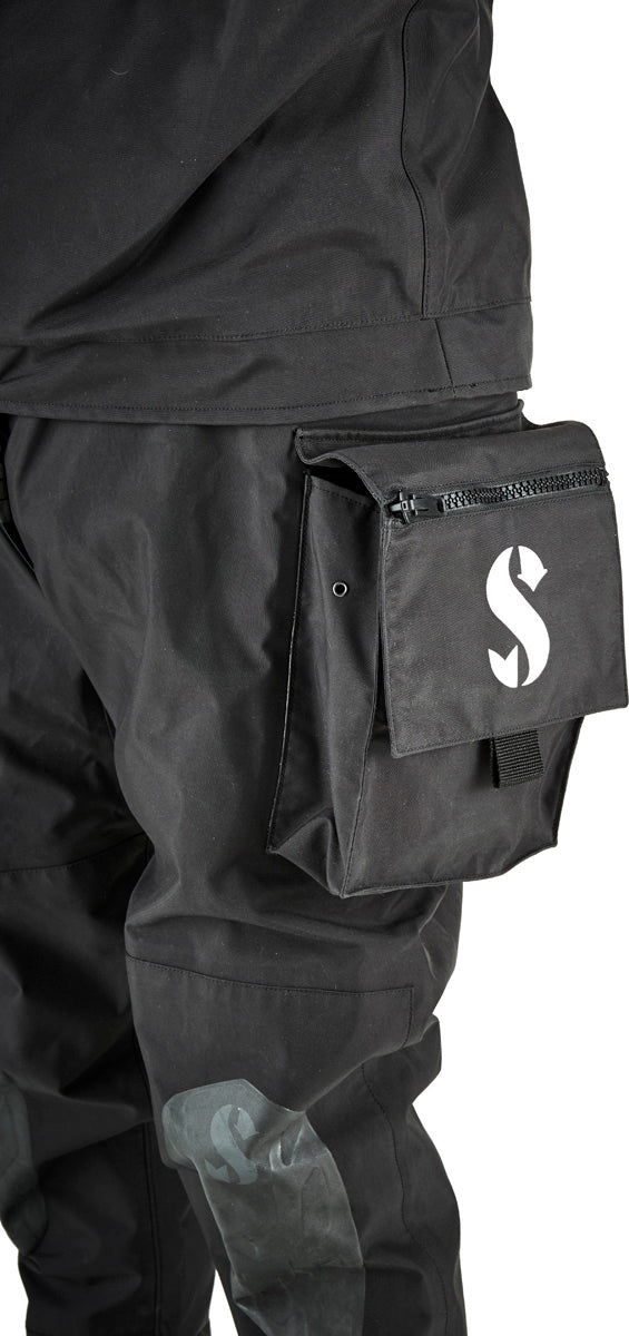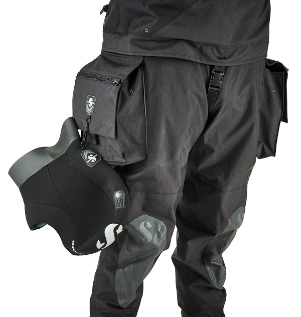 - 穿上干衣时,很容易在干衣内找到蓝色背带。它们还增强了合身性,并在潜水之间提供方便的下装支撑。