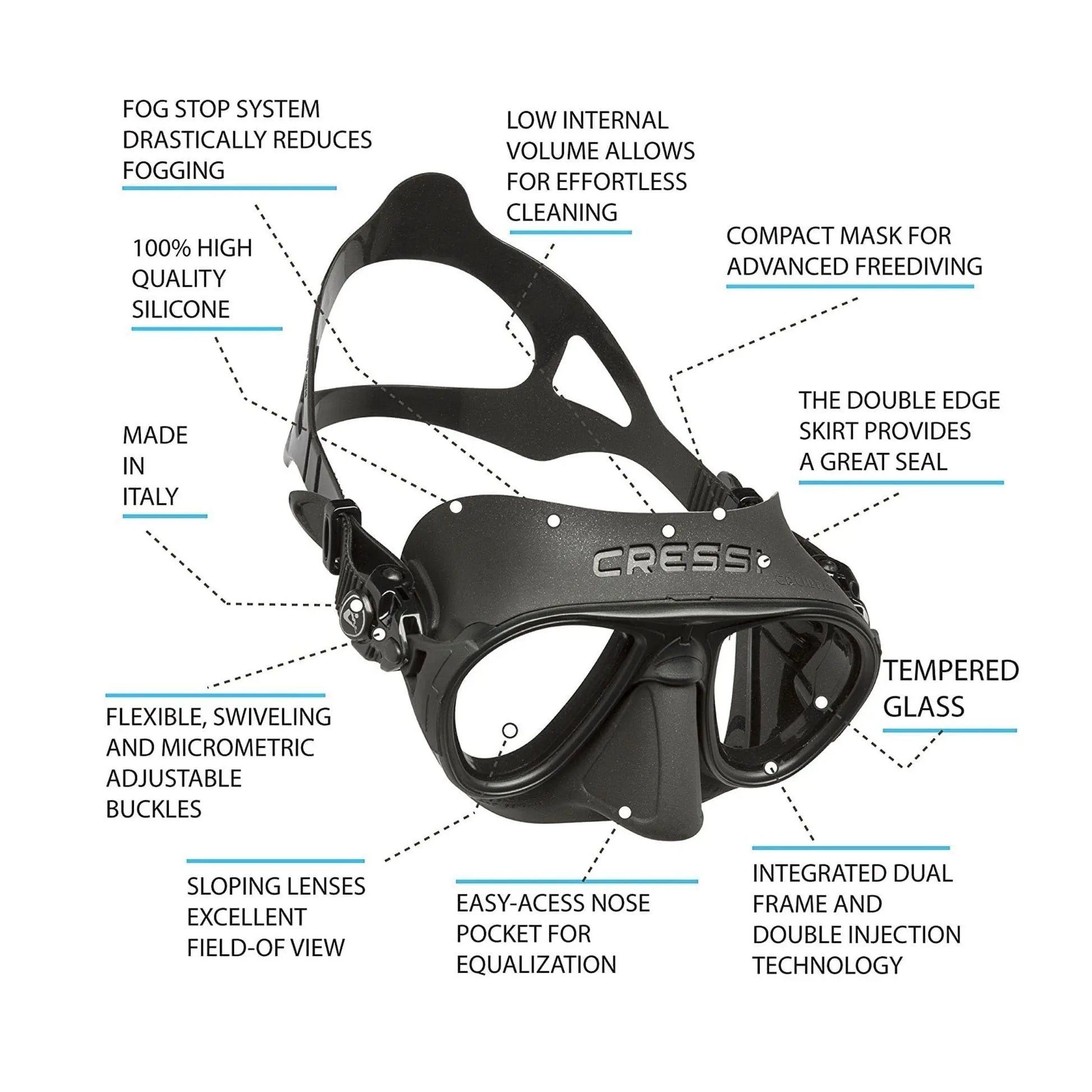 Cressi 的 Calibro 将最小的内部体积与由于框架的倾斜角度而产生的惊人视野结合在一起,这使其成为自由潜水完美的面罩,因为它的设计目的是提供潜水员感受到完全的自由和舒适。