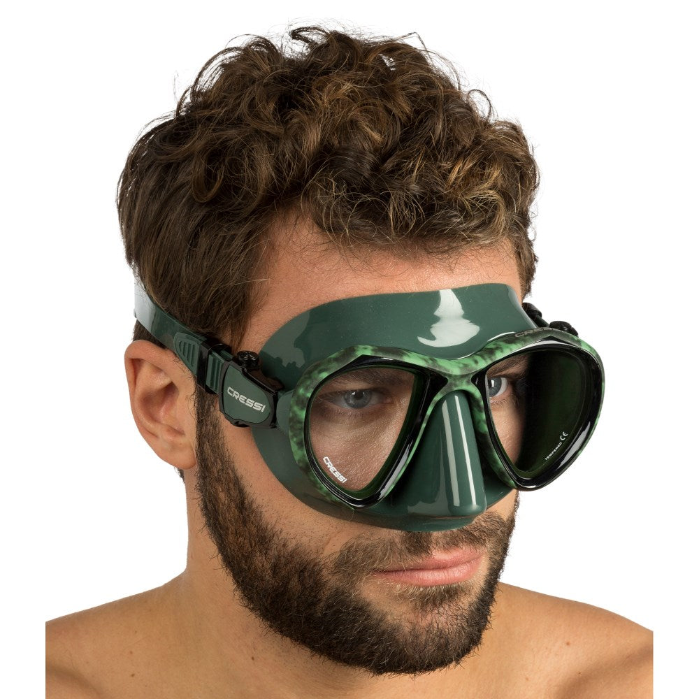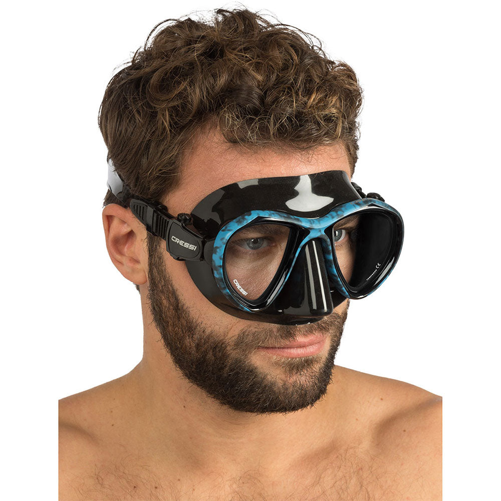 Metis 是一款双窗钢化玻璃镜片面罩,专为鱼叉捕鱼而设计,但也适用于水肺潜水和浮潜。
