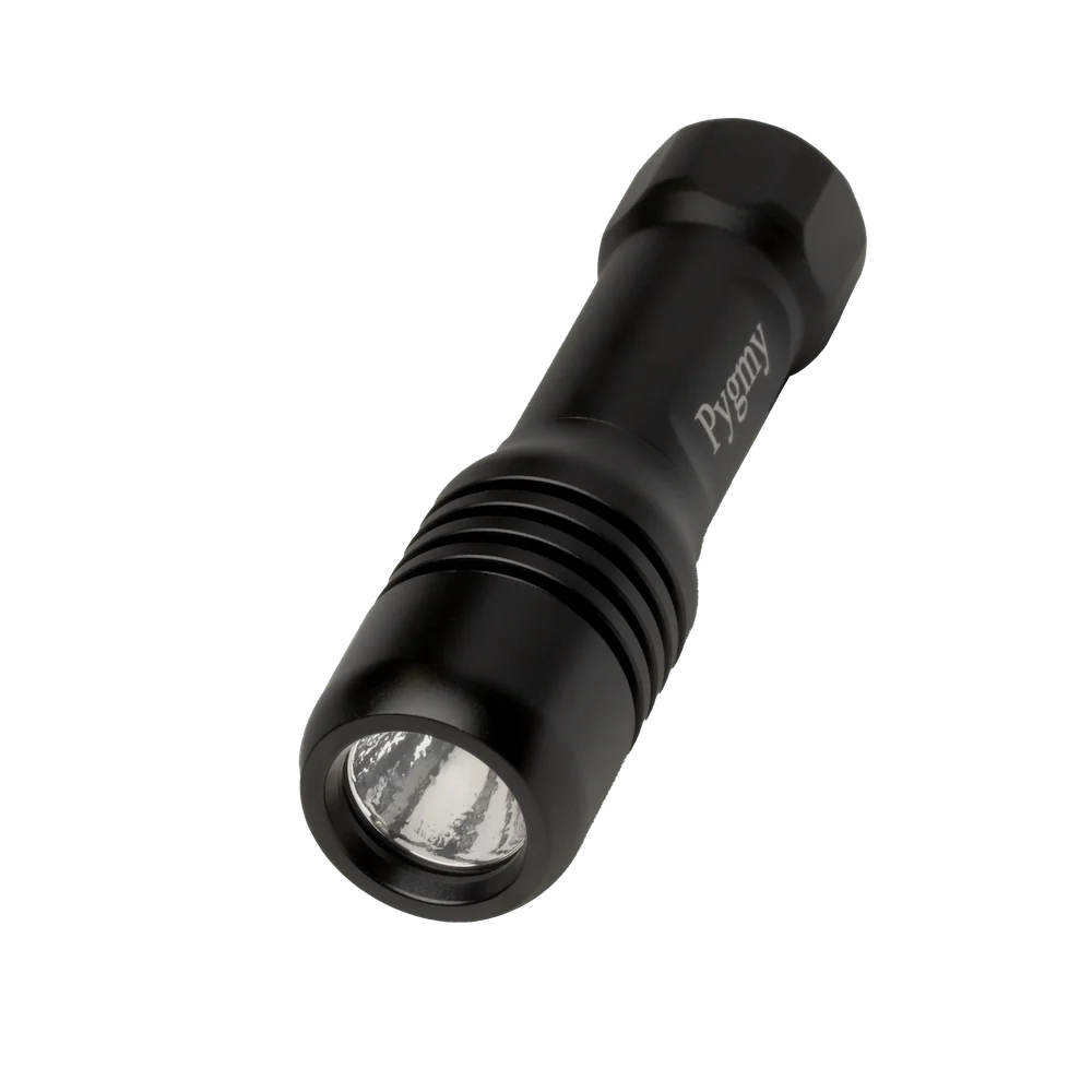 The pygmy is the smallest torch in our range that is perfect for putting in a pocket as a backup, attaching to a mask or cray loop. It has two light outputs based on the battery that is used. When run on the USB-C rechargeable battery it comes with the output is 600 lumens with a 75-minute runtime but run on a standard AA battery it drops down to 200 lumens, with an 80-minute runtime. It has a 10-degree beam angle and weighs just 3.2 oz.