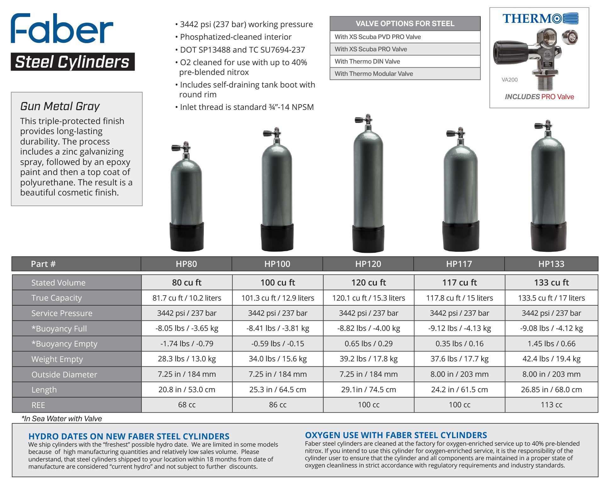 这些气瓶由欧洲领先的水肺潜水气瓶制造商 Faber 制造,采用符合国际标准的优质钢材。 Faber 气瓶展示了尺寸、重量和浮力的独特组合。