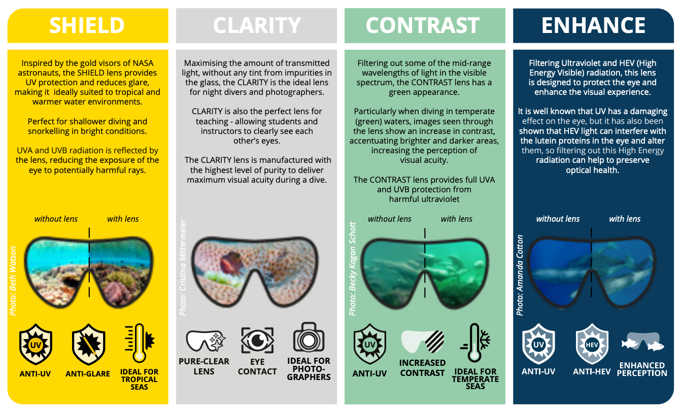 CLARITY 最大限度地提高了透射光量,且不会因玻璃中的杂质而产生任何色调,是夜间潜水者和摄影师的理想选择。 CLARITY 也是完美的教学镜片 - 让学生和教师能够清楚地看到彼此的眼睛。 CLARITY 镜片采用最高纯度制造,可在潜水期间提供最大的视力。