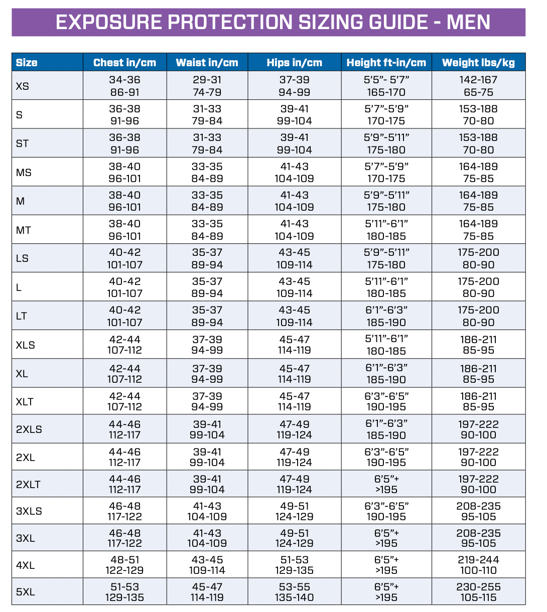 - 经 CE 认证为 A 级潜水服 - 额定水温范围为 45°F (7°C) 至 54°F (12°C)。