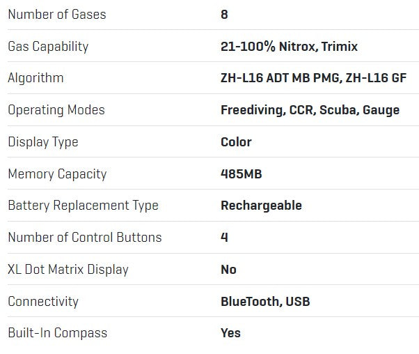 - 个性化潜水管理功能包括 PDIS(配置文件相关中间停止)和微泡保守程度,以匹配您的经验、年龄和身体状况。