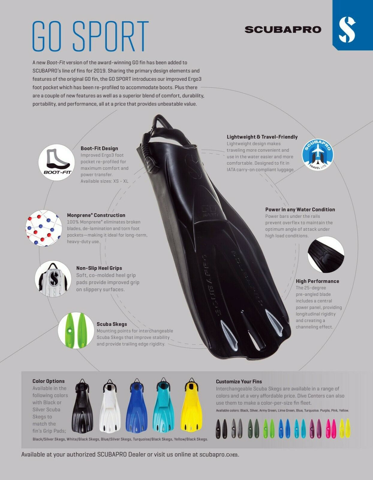 Go Sport 脚蹼现在具有肋骨连接点,以提供最大的稳定性。艉鳍/肋骨有多种颜色可供定制,并可在租赁操作中按颜色代码调整尺寸。