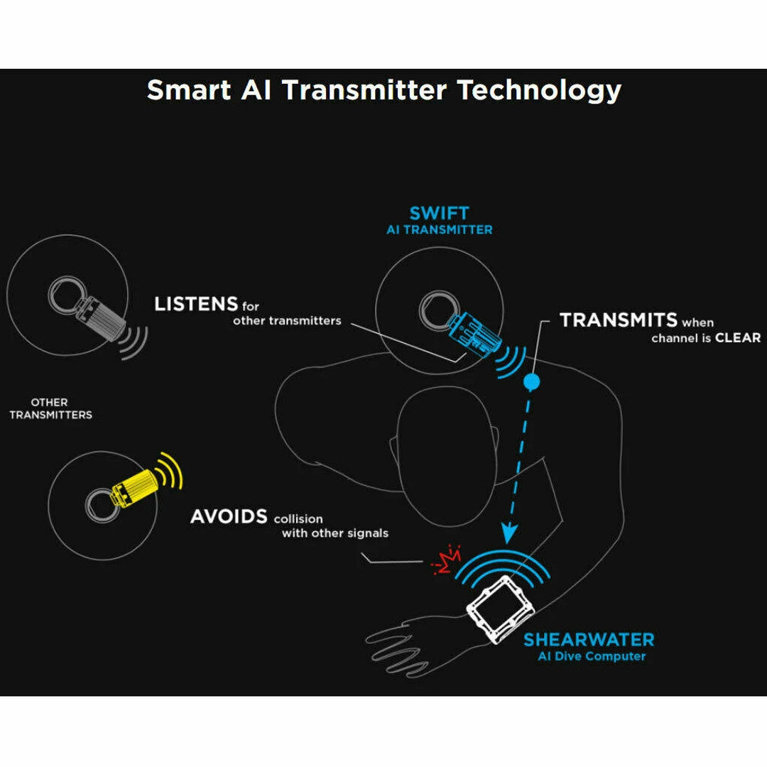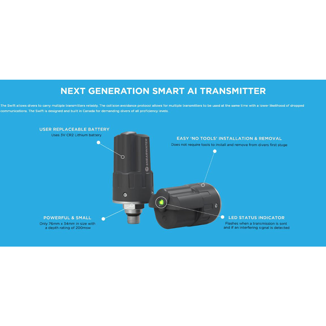 Shearwater Research SWIFT 罐压无线发射器与支持无软管空气集成的 Shearwater Research 品牌潜水电脑的特定型号的当前固件版本兼容。这包括 Shearwater Perdix AI、Teric 和 NERD 2 型号潜水电脑,但不包括不带 AI 名称的 Shearwater NERD 1、Petrel、Peregrine 或 Perdix。